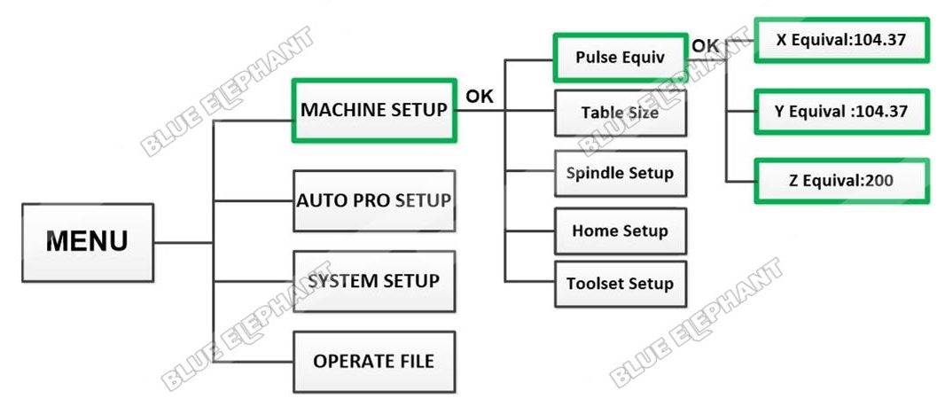 - 4.Input the data.The normal pulse of X axis is 104.37,Y axis is 104.37,Z axis is 200.Don’t forget press “OK”button after you set the data.