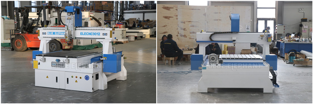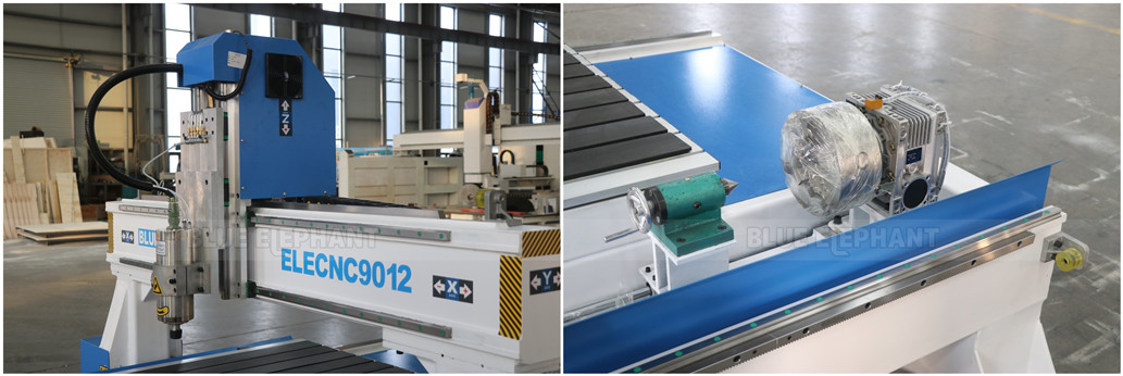 The working table size of 9012 CNC machine is 900*1200mm. That is customized according customer’s processing needs. It is equipped with the T-slot and PVC protect working table. By the way, you can also choose the T-slot and vacuum working table, which needs an additional vacuum pump. In addition, it is equipped with a rotary device that installed side on the machine. Choose the suitable diameter of the rotary device according to the size of your processing materials. And it is good at making cylindrical parts, such as wood table and chair legs, wood handrails, wood or plaster building columns, 3D statues, etc. Besides, with the optional positioning cylinder, the loading can be quickly positioned, saving loading time.